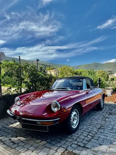 Peinture rayonnante (refaite dans les règles de l'art en 2009). Intérieur, chromes, sellerie, jantes, capote, couvre capote et instrumentation en très très bon état. Aucune corrosion (toujours stationnée en garage). Moteur fantastique avec un très gros plus pour vous assurer des années de bonheur sans frais de réparation : il a été refait à neuf par des spécialistes (notamment 08/2025 Garage Tony Faillace spécialiste de véhicules de collection et de courses et 09/2019 : Atelier spécialisé Alfa et anciennes Carlotti). Le moteur marche comme à son premier jour, démarre au quart de tour, monte rageusement dans les tours et délivre toute sa puissance avec une sonorité Alfa inégalable (ne me demandez pas si l'auto radio fonctionne je ne l'ai jamais allumé). Liste des interventions moteur récentes (factures) pour plus de 9.000 € : 2025 : pour terminer la rénovation du moteur, qu'il soit parfait et fonctionne comme à sa sortie d'usine : dépose et surfaçage culasse, rodage soupapes, remplacement tous joints moteur y compris joint de culasse. Changement thermostat, flexibles, durites, courroie, vidange, filtres essence et huile, entretien radiateur 2023 : remplacement pompe à essence par une pompe à essence électrique, c'est la seule concession à l'état d'origine (vient avec la pompe d'origine dans le coffre) car cela permet un démarrage dans 100 % des cas, c'est vraiment un plus pour une utilisation sereine. 2019 : embrayage émetteur récepteur et bocal . système de freinage + servo frein, cache culbuteur, palier transmission et rénovation carburateurs. Mais également par l'ancien propriétaire (factures) : 2017 : remplacement allumage, bobine, module et rotor. 2015 : réfection complète de la boite à vitesse + changement ligne d'échappement.