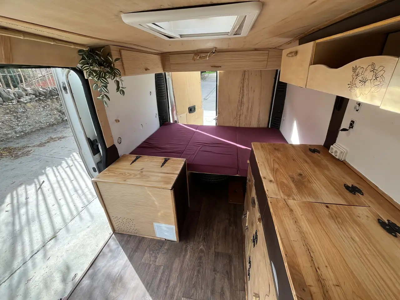 Preciosa furgoneta estilo rústico con cama, nevera, fregadero y fogones. Claraboya e instalación eléctrica con placa solar y conversor a 220w. Posibilidad de instalar chimenea o calefacción. Bien aislada.