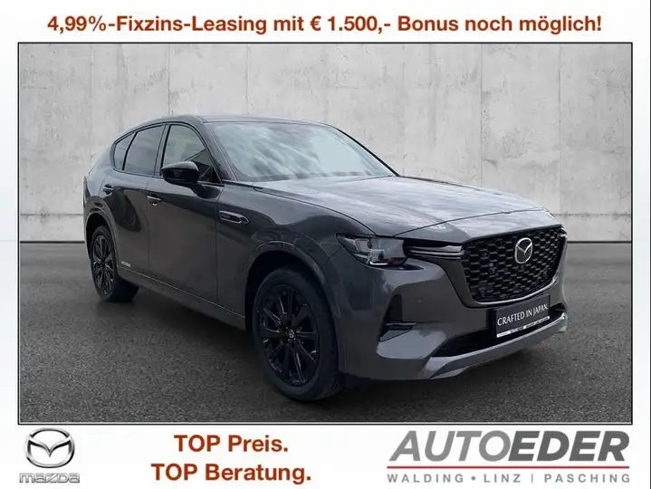Leasing-Bonus 1.500,-- bei Finanzierung über Mazda Finance noch möglich!! AUTO EDER - VERSICHERUNGSPAKET Mazda CX 60 ab 173,-- mtl. in Stufe 0 Inkl.Haftpflicht-Vers. 15 Mio. Deckung Inkl. Vollkasko mit SB 150,-- Inkl.Total-Verkehrs-Rechtschutz inkl.Insassenunfall !!! Die Informationen zu diesem Fahrzeug dient nur zur Werbung und stellt kein organisiertes Vertriebs- oder Dienstleistungssystem dar. Eine allfällige Zusendung eines Vertragsentwurfs (Kaufantragsentwurf) per E-Mail dient der bloßen Information und hat keinerlei Bindungswirkung. Erst nach einer Besichtigung und einer Probefahrt des Fahrzeuges (wenn vom Interessenten gewünscht) wird in unseren Geschäftsräumlichkeiten ein schriftlicher bindender Kaufvertrag (Kaufantrag) zur Unterfertigung angeboten. (laut WKO)