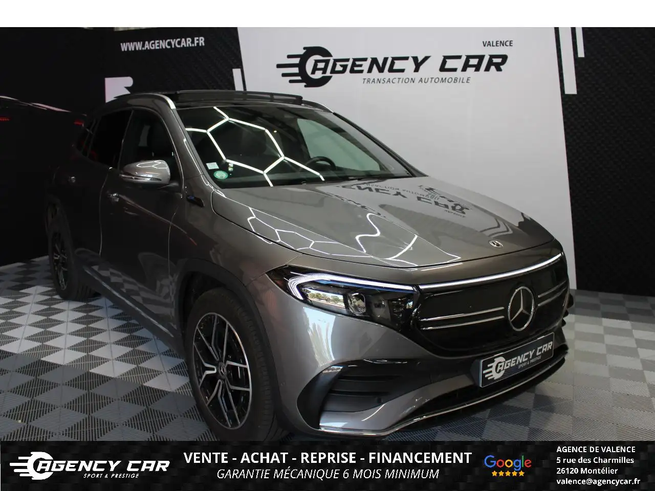 AGENCY CAR – Showroom automobile à ValenceDepuis 2014, AGENCY CAR vous accompagne dans vos projets d'achat de véhicules d'occasion avec sérieux et transparence.Notre agence de Valence vous propose ce véhicule :MERCEDES EQ A AMG LINE, GRIS FONCE, 6 cv, 5 portes, première mise en circulation le 12-07-2021, garantie 6 mois.Véhicule visible UNIQUEMENT SUR RENDEZ-VOUS à l'agence de Valence (26).Horaires d'ouverture :Mardi au Vendredi : 10h - 12h / 13h - 18hSamedi : 10h - 15hFinancement possible de 12 à 72 moisGarantie jusqu'à 48 mois en optionLivraison dans toute la France (sur devis)Des erreurs peuvent se glisser dans nos annonces. Merci de nous contacter pour toute confirmation d'équipements ou d'informations.Vidéo 360° du véhicule disponible sur notre site internet. Véhicules similaires Q4 E TRON, EQ B? X1, X2Les options : Jantes alliage AMG 48,3 cm (19') à 5 doubles branches, Pack Assistance à la conduite, Pack Premium, Sièges avant chauffants, Toit ouvrant panoramique, FRAIS DE DOSSIER - 690€, Pompe à chaleur, ADAPTIVE BRAKE avec fonction HOLD et aide au démarrage en côte, préremplissage et séchage des freins par freinage en cas de pluie, Bande lumineuse à LED (fonction feux arrière et antibrouillard arrière) entre les feux arrière à LED, Bande lumineuse à LED sur la face supérieure de la calandre, Calandre Black Panel spécifique AMG dans le design Twin-Blade avec cadre noir brillant, Chargeur embarqué 100 kW pour courant continu, Climatisation automatique THERMOTRONIC à 2 zones avec filtre à charbons actifs contre la poussière, la suie et le pollen, DYNAMIC SELECT avec les programmes de conduite « ECO », « Confort », « Sport » et « Individual », Fixations iSize pour siège-enfant avec sangle Top Tether aux places extérieures arrière, Pack Advantage, Pack Visibilté, Pavé tactile Touchpad, Pré-équipement pour l'autopartage via l'application Mercedes me Car Sharing, Pré-équipement pour les services à distance et de navigation Mercedes me (spécifique pour les véhicules électriques), Projecteurs hautes performances à technologie LED, Sièges avant avec réglages de la hauteur et de l'approche du siège, de l'inclinaison du dossier, de l'inclinaison de l'assise, de la profondeur de l'assise, Sièges sport avec garnitures en similicuir ARTICO/ microfibre DINAMICA noire et doubles surpiqûres rouges, Soutien lombaire à 4 réglages, Tapis de sol AMG, TEMPOMAT (régulateur et limiteur de vitesse)