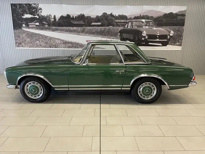 Die Pagode ist teilrestauriert (Werksaustauschmotor) und wurde vor ca. 20 Jahren neu lackiert. Der Wagen schaltet sich weich und einwandfrei.
