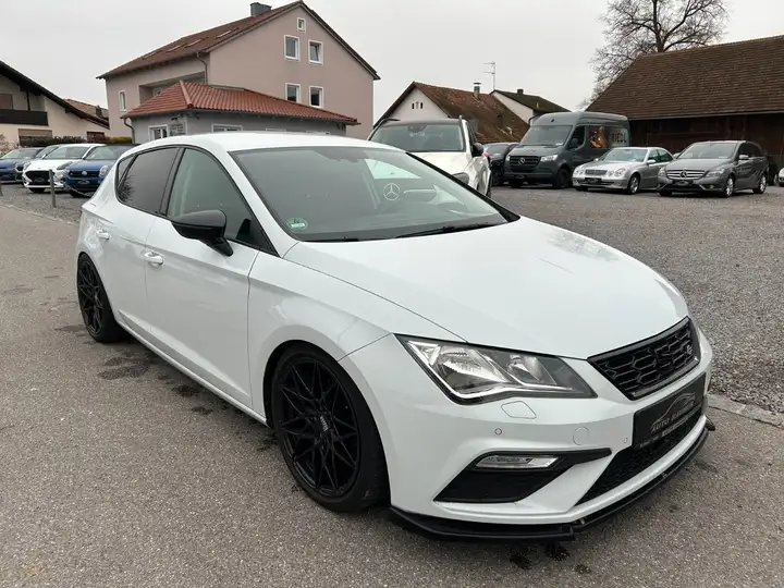 Ablagetasche an Vordersitzlehnen, Airbag Beifahrerseite abschaltbar, Airbag Fahrer-/Beifahrerseite, Antriebs-Schlupfregelung (ASR), AUX-IN-Anschluss und 2 x USB-Anschluss, Außenspiegel elektr. anklappbar, Außenspiegel elektr. verstell-, heiz- und anklappbar, beide, Außenspiegel mit Spiegelabsenkung, rechts, Außenspiegel und Türgriffe außen in Wagenfarbe, Außentemperaturanzeige, Blinkleuchten LED in Außenspiegel integriert, Bordcomputer, Bremsassistent, Doppelscheinwerfer, Elektron. Differentialsperre (EDS), Fahrassistenz-System: Berganfahr-Assistent (Hill-Holder), Fahrassistenz-System: Berganfahr-Assistent und Elektron. Differentialsperre, Fahrassistenz-System: Fahrprofilauswahl (SEAT Drive Profile), Fahrassistenz-System: Umfeldbeobachtungssystem (Front assist) mit City-Notbremsfunktion, Fensterheber elektrisch hinten, Handschuhfach beleuchtet, Heckleuchten LED, Innenausstattung: Chrom-Applikationen, Isofix-Aufnahmen für Kindersitz, Karosserie: 5-türig, Klimaanlage Climatronic 2-Zonen, Knieairbag Fahrerseite, Kopf-Airbag-System, Kopfstützen hinten (3-fach), Kopfstützen vorn verstellbar, Lendenwirbelstütze Sitz vorn links, verstellbar, Lendenwirbelstütze Sitz vorn rechts, verstellbar, Lenkrad (Sport/Leder), LM-Felgen, Mittelkonsole vorn mit Mittelarmlehne, Becherhalter, Ablagebox und Luftausströmer hinten, Modellpflege, Motor 1,5 Ltr. - 96 kW 16V TSI ACT, Otto-Partikelfilter (OPF), Parkbremse elektrisch, Reifen-Reparaturset, Reifenkontroll-Anzeige, Rücksitzlehne geteilt/klappbar (1/3-2/3), Schadstoffarm nach Abgasnorm Euro 6d-TEMP, Schalt-/Wählhebelgriff Leder, SEAT Media-System Plus, Seitenairbag, Seitenscheiben hinten und Heckscheibe abgedunkelt, Sitz vorn links höhenverstellbar, Sitz vorn rechts höhenverstellbar, Sonnenblende links mit Spiegel (beleuchtet), Sonnenblende rechts mit Spiegel (beleuchtet), Sport-Fahrwerk FR / Cupra, Sportsitze vorn, Start/Stop-Anlage, Stau-/Ablagefach unter Sitze vorn, Steckdose (12V-Anschluß) vorn, Stoßfänger lackiert, Wärmeschutzverglasung