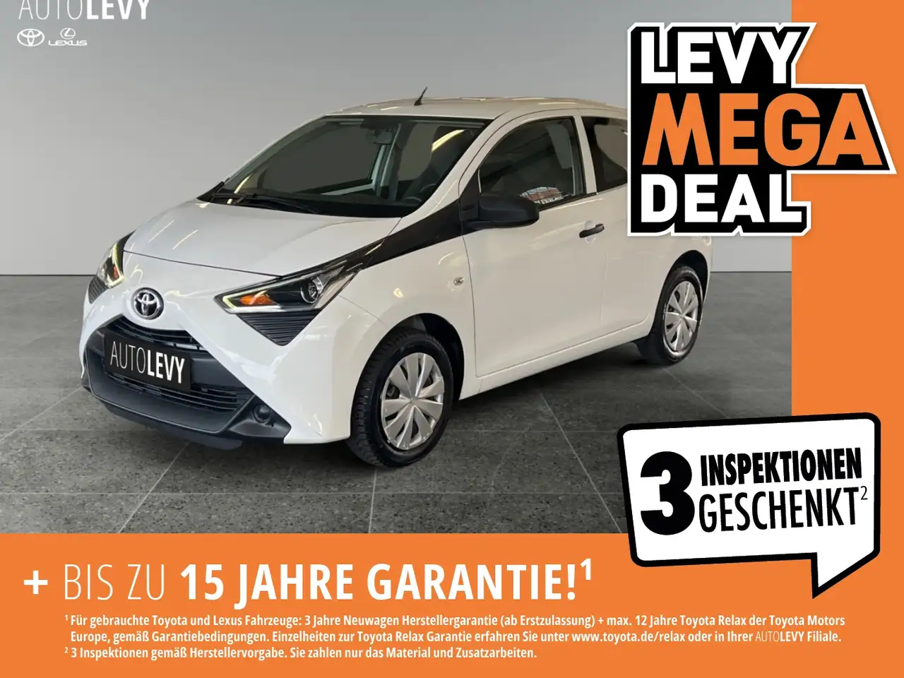 - Bis zu 15 Jahre Garantie (3 Jahre Neuwagenherstellergarantie und max. 12 Jahre Toyota Relax Anschlussgarantie der Toyota Motor Europe - gemäß Garantiebedingungen unter www.toyota.de/relax) und 3 Inspektionen (4.,5. und 6. Jahresinspektion, Details siehe autolevy.de/garantieversprechen) geschenkt. Inspektion gem. Herstellervorgabe zzgl. Material und Zusatzarbeiten – nur gültig in unseren Filialen.