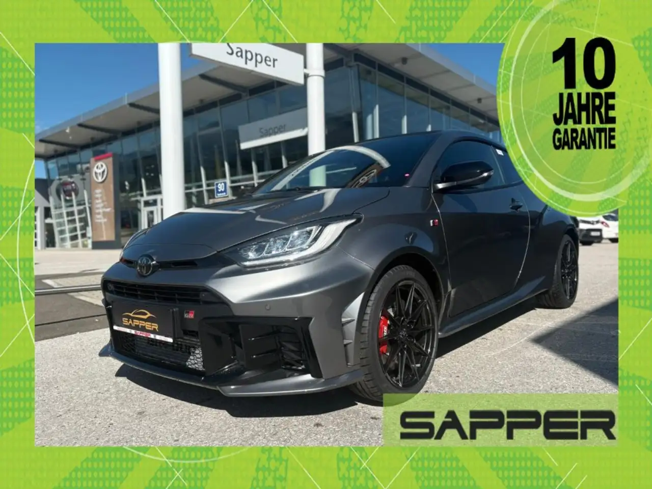 palladium silber, A2, 18" Leichtmetallfelgen, 15 Speichen, schwarz, Ablagefächer in den Türen, Konventionelle Handbremse, Ablagefach in der Mittelkonsole, Garantie, Fahrer- und Beifahrer-Airbag, (Beifahrerairbag deaktivierbar), Türgriffe außen in Wagenfarbe lackiert, Auf-& Abblendautomatik, Adaptiver Tempomat, Außenspiegel in Kontrastfarbe, schwarz, Scheibenbremsen vorne und hinten, Klimaautomatik, 2-Zonen, Dach aus Kohlefaser verstärktem Kunststoff, Kontrastfarbe, Multimedia Audiosystem Toyota Touch 2, Fernlicht-Assistent (AHB), JBL Premium-Soundsystem, Fahrersitz manuell längs- und höhenverstellbar, Handschuhfach, Torsen Sperrdifferential, Front-& Hinterachse, Reifenreparaturkit mit Kompressor und Dichtmittel, Uni-Lackierung, Pre-Collision System, Beifahrersitz manuell längsverstellbar, Rückfahrkamera, Sitzbezüge Alcantara®/ Leder mit GR-Logo, 3-Punkt-Sicherheitsgurte mit Sicherheitsgurtwarnsystem vorne mit Gurtstraffer und Gurtkraftbegrenzer, Toter Winkel Warner (BSM), Rückraumassistent, Seitenaufprallschutz, Heckscheibenheizung, Seitenairbag für Fahrer und Beifahrer, LED-Nebelscheinwerfer, Wegfahrsperre, elektronisch, Sportpedalerie (Aluminium), 8-Gang Automatisiertes Schaltgetriebe, Start & Stop System, ABS + EBD, Intelligentes Zugangssystem, Fahrmodi-Auswahl (Sport/Normal/Track), Motor-Unterfahrschutz, verstärkt, Digital Key, Auspuffendrohre, doppelbordig, verchomt, Sitzheizung für Fahrer und Beifahrer, Innenspiegel automatisch abblendend, Kopfairbag für Fahrer und Beifahrer, GR FOUR Allradsystem, Scheinwerfer Ein/Aus-Automatik mittels Lichtsensor, GR Sportsitze, Heckleuchten mit LED-Leuchtband und LED-Blinker, Bremssättel, rot mit GR-Logo, Kontrastnähte und Highlights in Silber oder Rot für Sitze, Lenkrad, Handbremse und Schaltknüppel, Fahrzeugstabilitäts- (VSC) und Traktionskontrolle (TRC), ISOFIX-Kindersitzbefestigung, Einparksensoren vorne und hinten, Abgedunkelte Scheiben ab der B-Säule, GR Lederlenkrad, beheizbar, Reifendruckwarnsystem, Spurhalte-Assistent (LDA) und Spurverfolgungs-Assistent (LTA), Servolenkung, elektrisch (EPS), geschwindigkeitsabhängig, 4,2" Multi-Informationsdisplay, Bremsassistent, Verkehrszeichen-Assistent, GR Serien-Hochleistungs-Fahrwerk, Berganfahrhilfe, Rücksitzbank geteilt umklappbar (60:40) (2 Sitzplätze), Fernbedienung für Zentralverriegelung, Ausstiegsassistent, LED-Frontscheinwerfer, Außenspiegel elektrisch beheiz-, verstell und einklappbar, Fensterheber vorne elektrisch mit Einklemmschutz, LED-Tagfahrlicht mit integrierten Blinkern, Scheinwerferhöhenverstellung manuell, 18" Leichtmetallfelgen, 10 Speichen, schwarz, Technik Paket