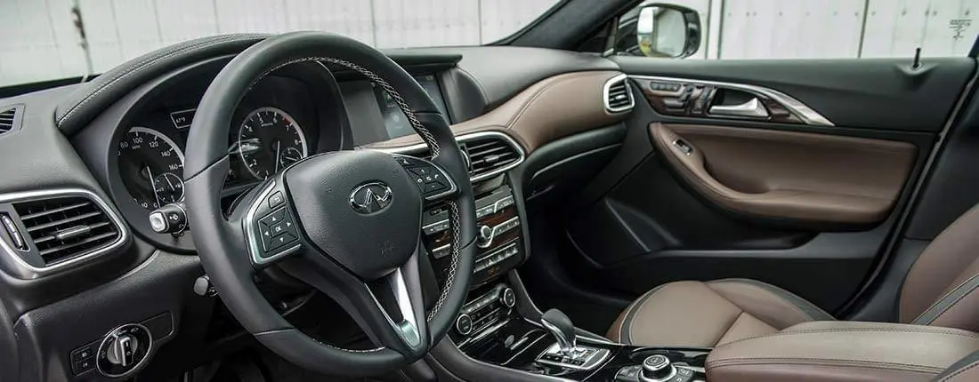 Innen glänzt der Infiniti durch den Einsatz von viel Chrom und auch Holz im Cockpit. Zahlreiche Flächen sind mit gesteppten Nähten an den hochwertig anmutenden Kunststoffflächen abgesetzt. Das Gleiche gilt für die komfortablen und beheizbaren Sitze mit elektrischen Sitzeinstellungen für die Vordersitze oben in den Holzverkleidungen der Türen. Das Cockpit im Infiniti QX30 ist übersichtlich und klar mit zwei analogen Rundinstrumenten und vielen digitalen Anzeigen ausgestattet. Ein Bordcomputer ist ebenso an Bord und wichtige Helfer wie ein Navigationssystem, für das ein großer Bildschirm in genau in der Mitte des Armaturenträgers Platz findet, ist in Paketen zubuchbar oder in besseren Varianten bereits inklusive. Klimaanlage ist Serie und ein elektrisches Schiebedach sowie eine Rückfahrkamera ist als Zubehör möglich.