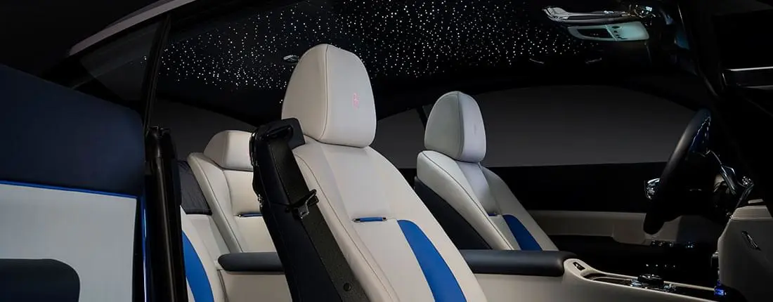 Feine Materialien und eine tadellose Verarbeitung dürfen bei dem Preis des Rolls-Royce Wraith natürlich erwartet werden. Auch die sehr guten Platzverhältnisse im Innenraum und der überragende Fahrkomfort sind immer gegeben. Eine Besonderheit ist der Sternenhimmel, der durch 1.300 Leuchtelemente realisiert wird.