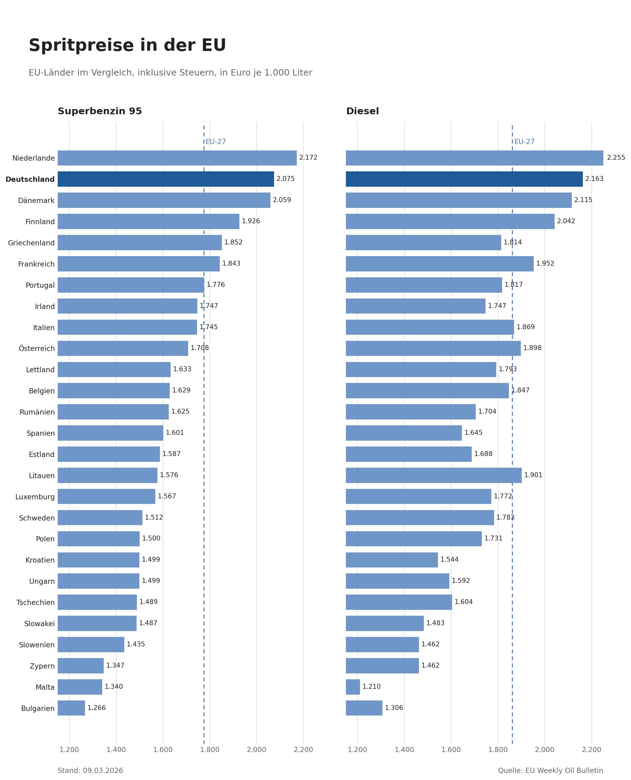 Auf Rang drei folgte Dänemark mit 2,06 Euro. Frankreich lag mit 1,84 Euro ebenfalls im oberen Bereich, Italien kam auf 1,75 Euro, Spanien auf vergleichsweise moderate 1,60 Euro. Am günstigsten war Super in Bulgarien mit 1,27 Euro je Liter, davor lagen Malta mit 1,34 Euro und Zypern mit 1,35 Euro.